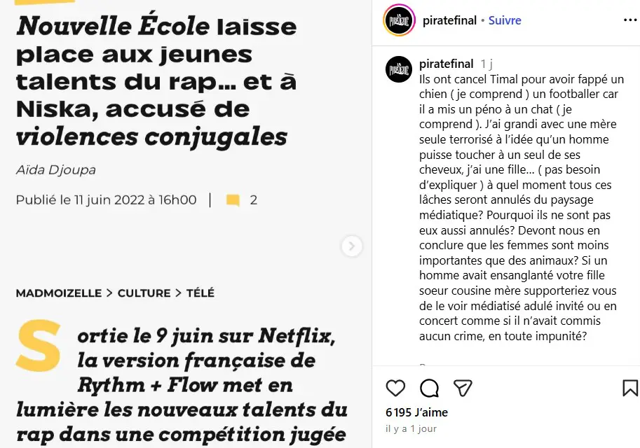 « Nouvelle École laisse place aux jeunes talents du rap… et à Niska, accusé de violences conjugales » titrait l’article. Booba a repartagé l’article, ainsi que d’autres sur d’autres accusations comme Rohff, RK ou encore Joey Starr pour pouvoir s’exprimer sur certaines personnalités encore présentes et non boycottées suite à des affaires de violences.