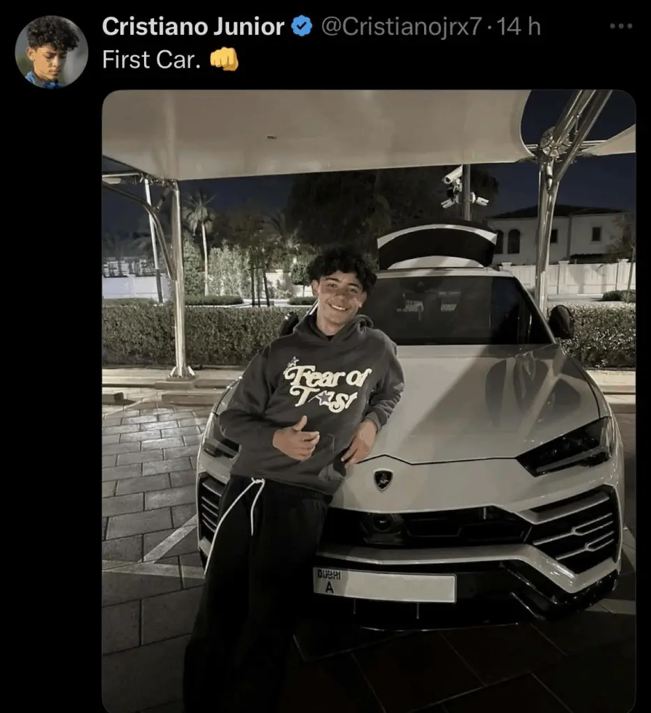 Pour ce qui est des stars, et surtout des fils de stars, ces derniers ne vivent pas le moment comme le commun des mortels. C’est le cas du fils de Cristiano Ronaldo. CR Junior a posté une photo de lui avec sa première voiture, une Lamborghini Urus. « First car » a-t-il ajouté en légende.