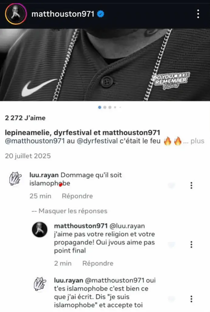 En réponse à un commentaire, Matt Houston a en effet fait réagir. « Dommage qu’il soit islamophobe » avançait le commentaire. Le rappeur n’a pas démenti, et il a même continué dans ce message de haine. « Je n’aime pas votre religion et votre propagande. Oui, je ne vous aime, point final. »